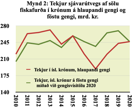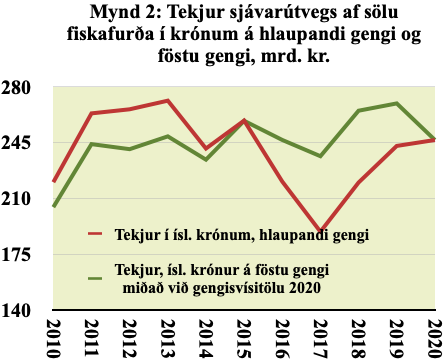 Sveiflurnar í mynd 1 stafa að hluta af breytingum á gengi. Íslenska krónan var sterk á árunum 2016 til 2018 sem leiddi til þess að tekjur sjávarútvegs mældar í íslenskum krónum lækkuðu. Tekjur hans eru að mestu leyti í erlendum gjaldeyri og stórir kostnaðarliðir eru einnig háðir gengi en laun virðast að mestu óháð því. Tekjur í erlendum gjaldeyri eru því líklega betri mælikvarði á afkomu sjávarútvegs en tekjur í íslenskum krónum á hlaupandi gengi.