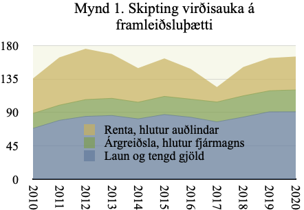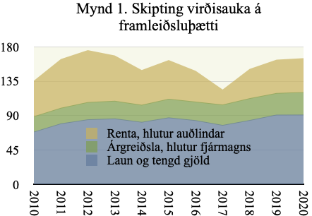 Til skipta á haghafa 2010 – 2020 voru 1.709 mrd. kr. Laun og tengd gjöld, 920 mrd. kr. voru 54% hluti vinnu í virðisaukanum. Hluti fjármagns var 270 mrd. kr.,16% virðisaukans, en tekjur eigenda fjármagns voru 714 mrd. kr., þ.e. 42% virðisaukans. Framlag auðlindar, var 519 mrd. kr. eða 30% virðisaukans en greiðsla til eigenda hennar var 75 mrd. kr. Það er um 4% virðisaukans.