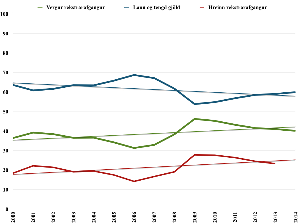 Hlutfall launa og tengdra gjalda af þáttatekjum hefur farið lækkandi á þessum 15 árum. Hlutfall launa var nálægt 63% á árunum fyrir 2006 en hefur verið undir 60% á síðustu árum. Áhrif hrunsins eru auðsæ og ljóst að afleiðingar þess komu meira niður á launatekjum en tekjum af fjármagni. Þótt hlutfall launa hafi eitthvað hækkað er það þó enn verulega lægra en það fyrir hrun.