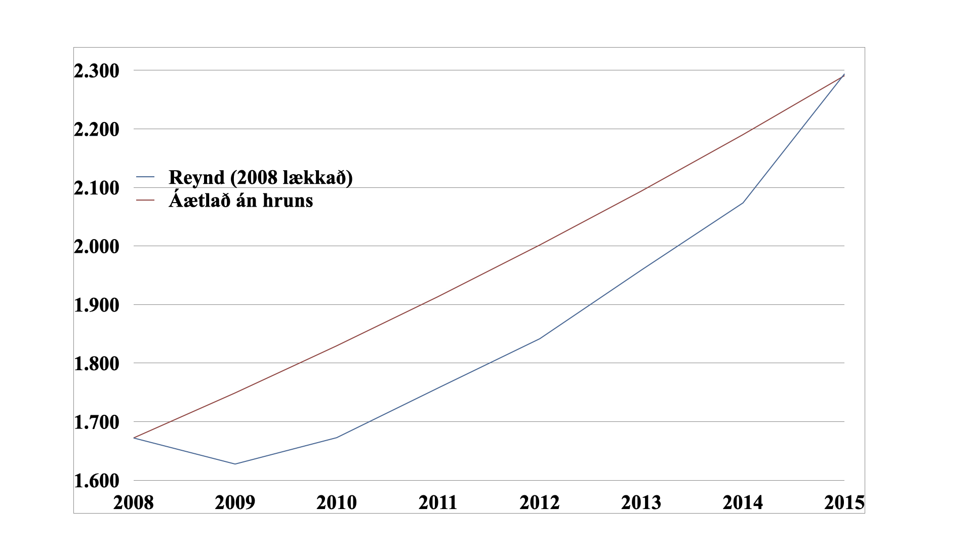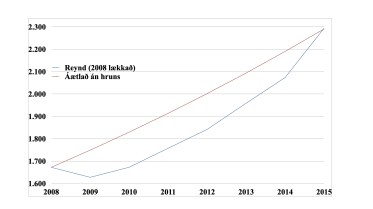 Áður en lengra er haldið er gott að áætla hugsanlegt umfang kreppunnar og gera sér grein fyrir eðli hennar. Byrja má á samanburði við hrunið 2008 sem teygði teygði halann sinn allt til 2014. Lauslega má ætla að tekjutap þjóðarbúsins á þeim árum hafi verið um 40% af vergri landsframleiðslu eins árs. Er þá gengið út frá því að ofþensla VLF á árinu 2008 hafi verið um 10% og að verg landsframleiðsla án hruns hefði vaxið frá þeim grunni með jöfnum hraða til ársins 2015 að hún hefði náð vergri landsframleiðslu þess árs eins og hún varð. Sá ferill er í samræmi við þróun atvinnuleysis á þessum tíma. Sé þessi áætlun nærri lagi varð tekjumissir í þjóðarbúinu eftir Hrunið um 1.200 milljarðar króna miðað við árið 2019 eða um 700 milljarðar króna miðað við árið 2009.